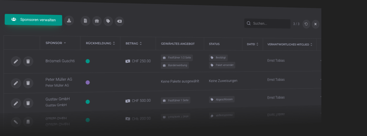Mit DigitalMembers notifizierst du mögliche und bestehende Sponsoren in Sekundenschnelle, schreibst persönliche Dankesbriefe und erinnerst automatisch an anstehende oder offene Sponsorings.